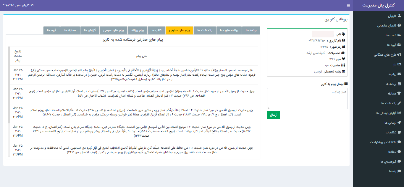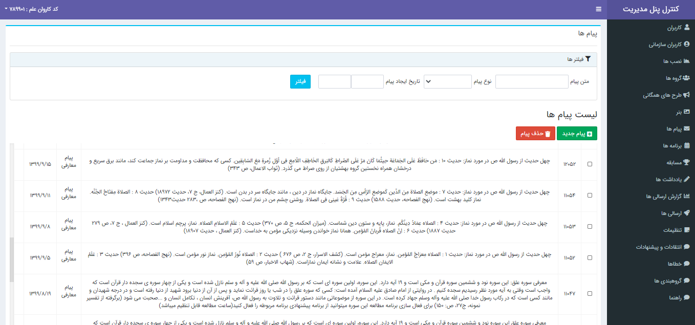 پیام معارفی: یک متن مفصلتر و رنگ بندی شده است که می تواند حاوی مطالب مذهبی و معارفی باشد. این پیام در صندوق پیامهای کاربر قرار می گیرد.