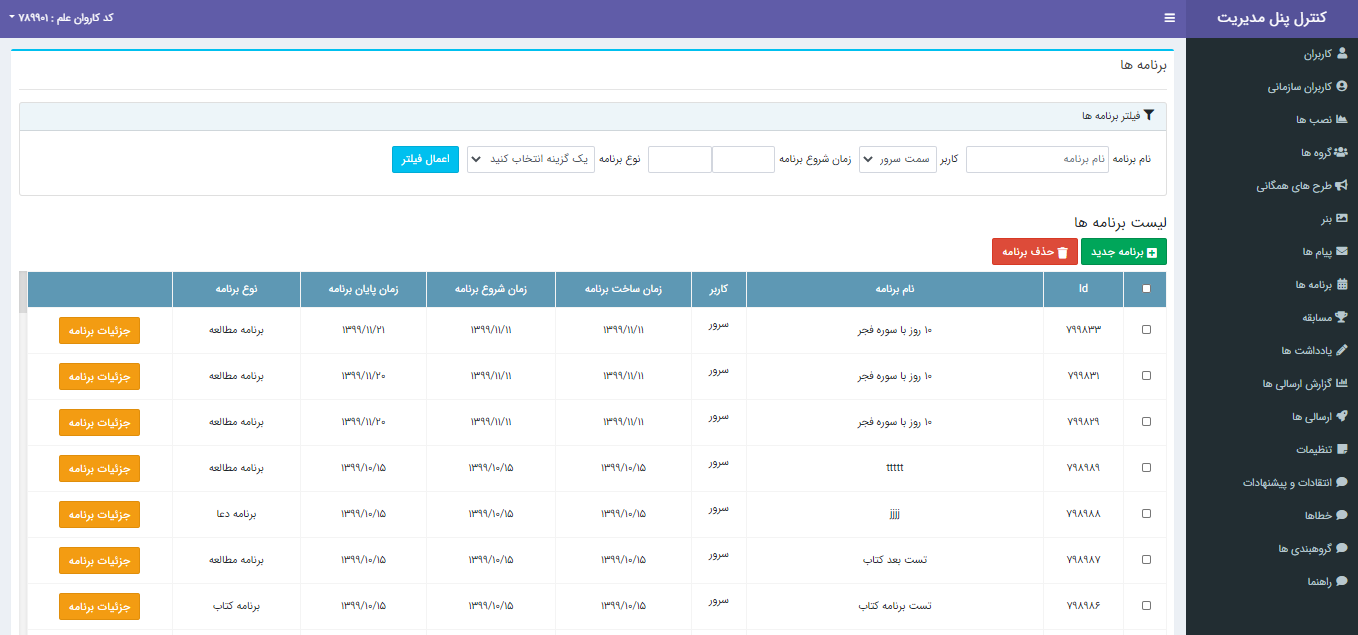 امکان ارسال برنامه های پیشنهادی برای مطالعه محتوی مذهبی اعم از برنامه مطالعه قرآن، نهج البلاغه، صحیفه، ادعیه و زیارات، روایات و کتب مذهبی برای کاربران و فعال سازی توسط آنها.