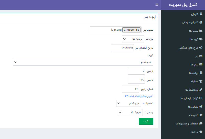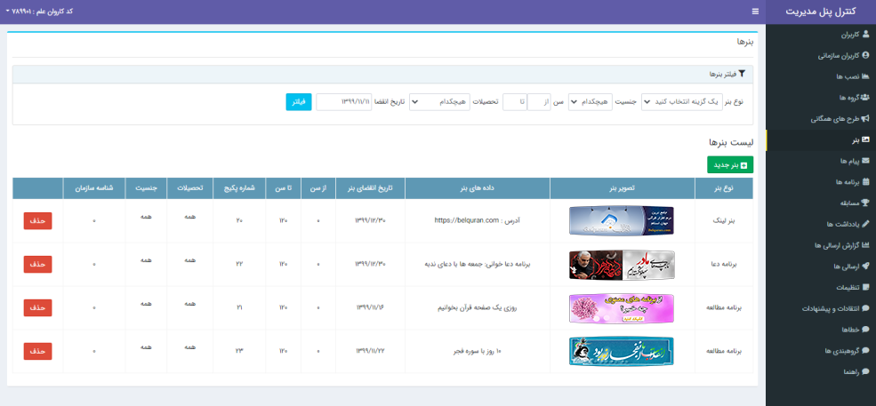 مدیر سایت می تواند بنرهایی با طرح های گرافیکی و محتوای معنوی تهیه نموده و برای کاربران ارسال نماید تا در صفحه اول نرم افزار کاربران نمایش داده شود، ضمنا مدیر سایت می تواند در ذیل هر بنر، برنامه های مطالعه پیشنهادی و یا پیشنهادات ویژه برای استفاده از سایر امکانات منادی از قبیل مسابقه، کتابخانه یا .... را نیز قرار دهد.