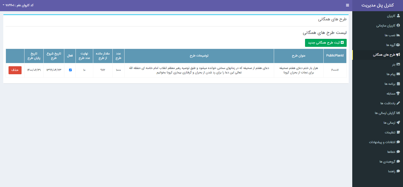 مثلا مدیر می تواند طرحی با عنوان 110 ختم سوره انسان را ایجاد نماید و کاربران هر کدام از 1 تا 5 بار قرائت سوره انسان را بپذیرند و در طی مدت 10 روز این طرح را به صورت گروهی انجام دهند.